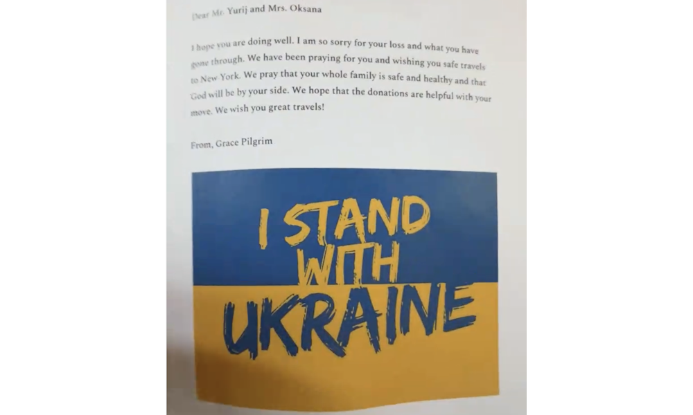 “Dearest Yuriy and Oksana, you have all my sympathy because of this war. We hope our donations will help you in New York. We hope for peace in your home country. You will be in our prayers, and we will stand with Ukraine. Let God be among us and help you through your hard times of need. Sincerely, Ian.”